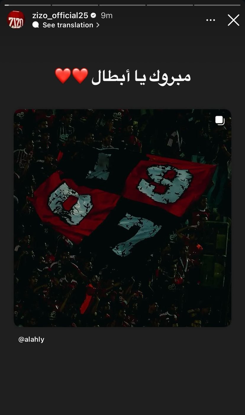 ونشر زيزو ستوري علي انستجرام صورة لجماهير الأهلي وكتب “مبروك يا أبطال”، بعدما غاب زيزو عن القمة بسبب الإصابة في العضلة الضامة.