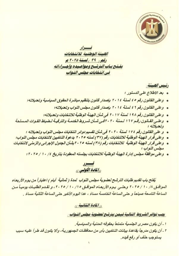 أعلنت الهيئة الوطنية للانتخابات برئاسة القاضي حازم بدوي عن المستندات المطلوبة للمترشحين الراغبين في الترشح لانتخابات مجلس النواب، وذلك ضمن الإجراءات الرسمية للكشوف الانتخابية.
