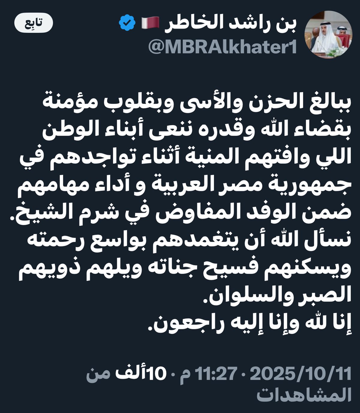 من جانبها، أبدت الدوائر الدبلوماسية القطرية حزنها العميق وتعازيها لأسر الضحايا، مؤكدة أنها تتابع مع الجهات المصرية تفاصيل الحادث وسير التحقيقات.