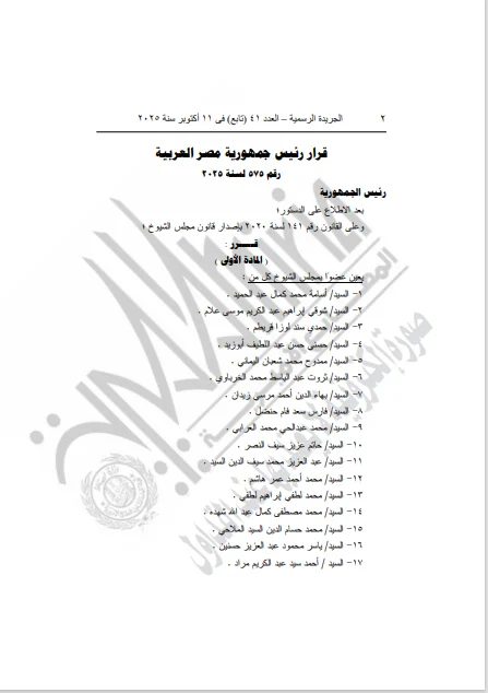 أصدر السيد الرئيس عبد الفتاح السيسى رقم 575 لسنة 2025 بأن يعين عضوًا بمجلس الشيوخ كل من: