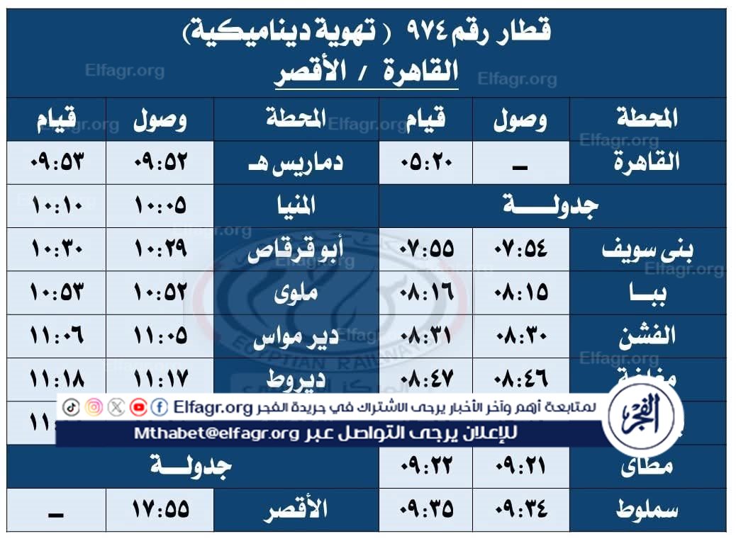 قطار رقم 1001 روسي يغادر المنيا الساعة 09:55 صباحًا ويصل القاهرة 13:15 ظهرًا.
