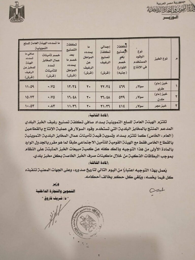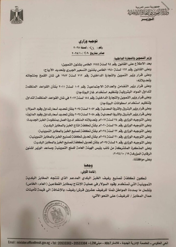 وجاء القرار بعد الاطلاع على القوانين والقرارات المنظمة لشؤون التموين والتسعير الجبري وتداول المواد البترولية، إضافة إلى التوجيهات الوزارية السابقة المنظمة لمنظومة إنتاج الخبز المدعم.