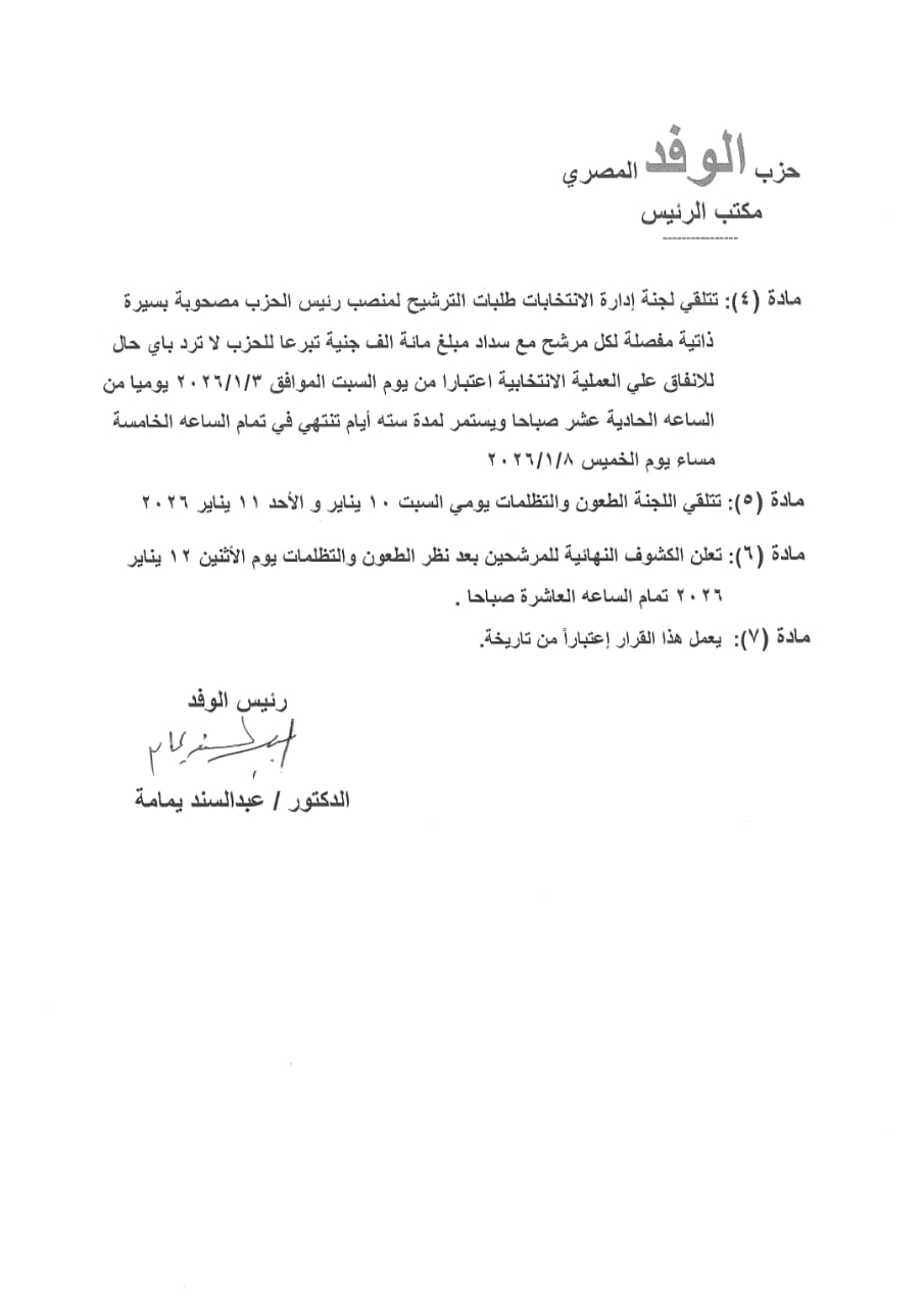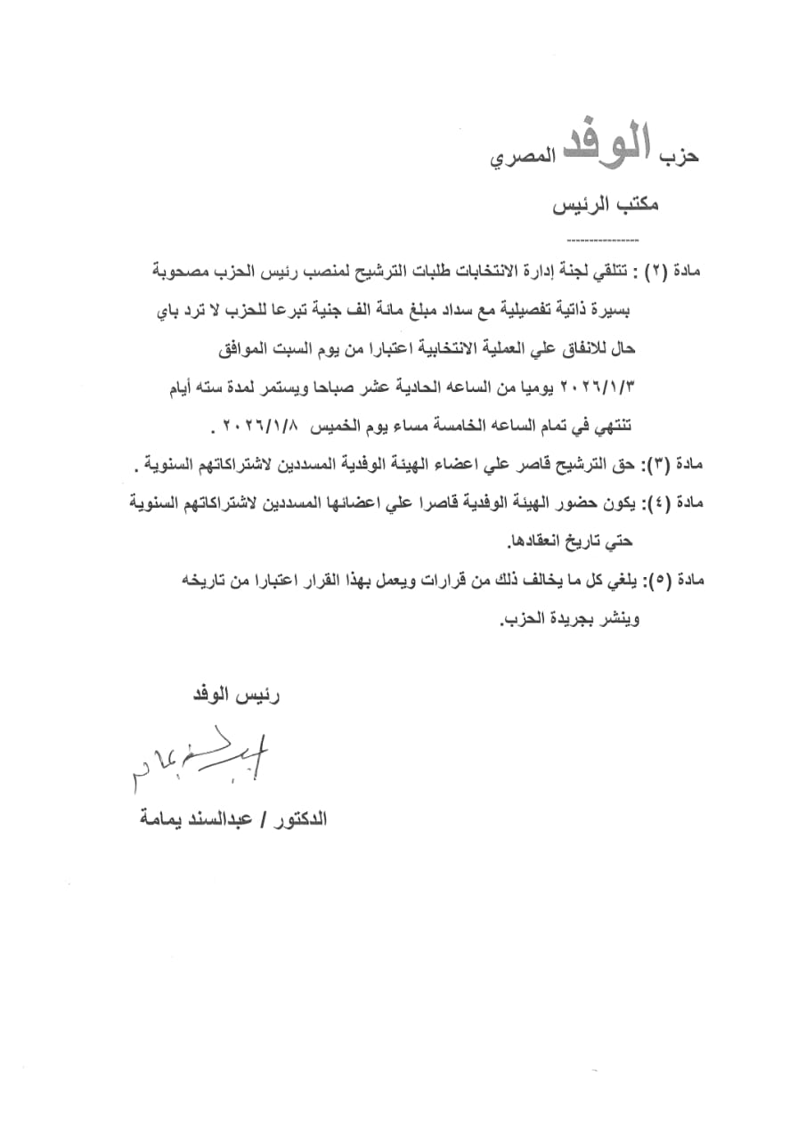 حدّد حزب الوفد شروطًا وإجراءاتً رسمية للترشّح لمنصب رئيس الحزب، ضمن خطاب التنظيم الداخلي الذي أعلنه رئيس الحزب عبدالسند يمامة في قراره رقم 49 لسنة 2025، الذي دعا بموجبه الهيئة العمومية للحزب للانعقاد في 23 يناير 2026، وانتخاب رئيس جديد في 30 يناير 2026.