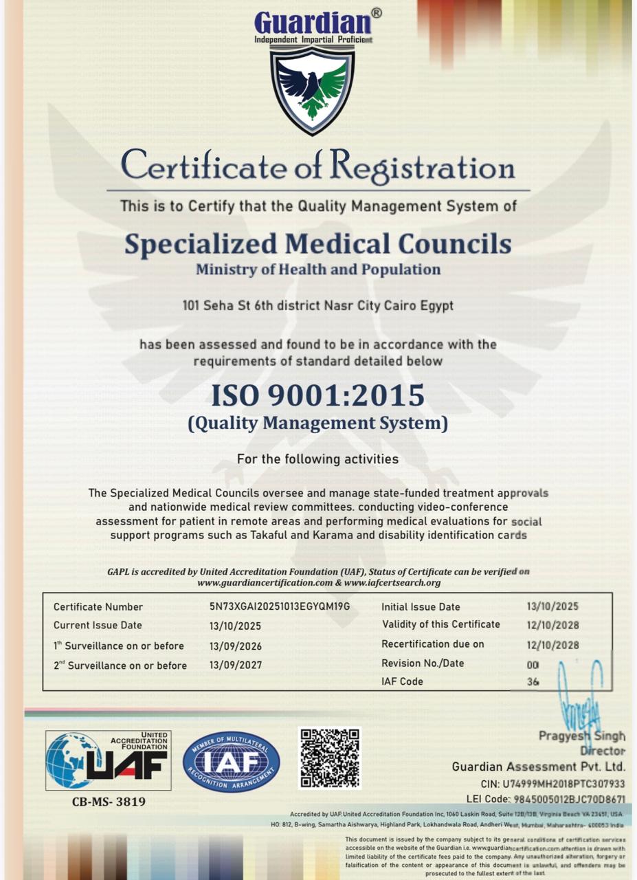 الصحة: حصول الإدارة العامة للمجالس الطبية المتخصصة على شهادة الاعتماد الدولي لنظام إدارة الجودة ISO 9001:2015