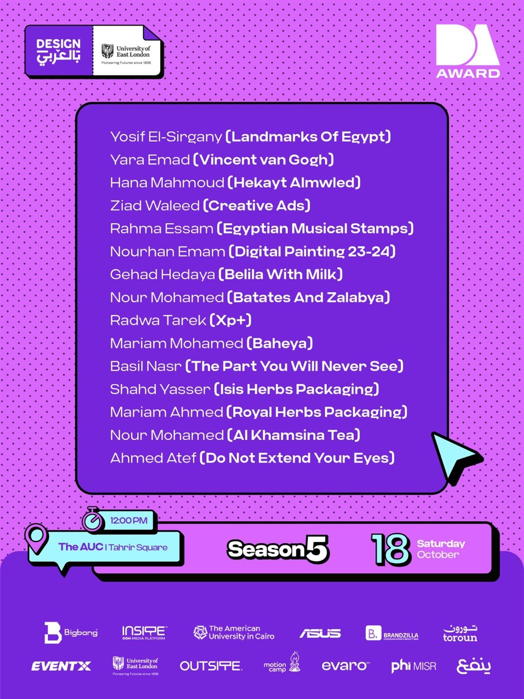 وقد جاءت مشاركات طلاب قسم الإعلان والإعلان الرقمي لتعكس تنوع الفكر والرؤية الفنية المبتكرة، حيث شارك كل من رضوى طارق قسم إعلان، وأميرة قسم إعلان، وزياد وليد الفرقة الثانية، إعلان رقمي، الذين قدموا أعمالًا عكست وعيًا فنيًا معاصرًا وقدرة على توظيف أدوات التصميم الجرافيكي في التعبير عن أفكار إبداعية ذات طابع عربي مميز.