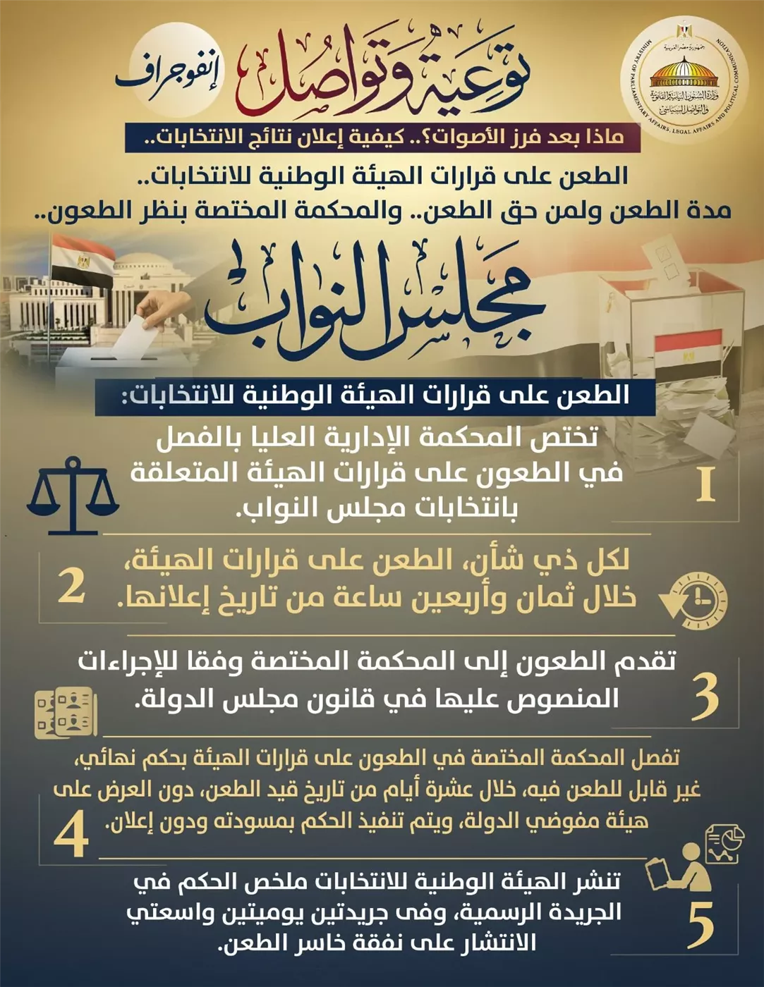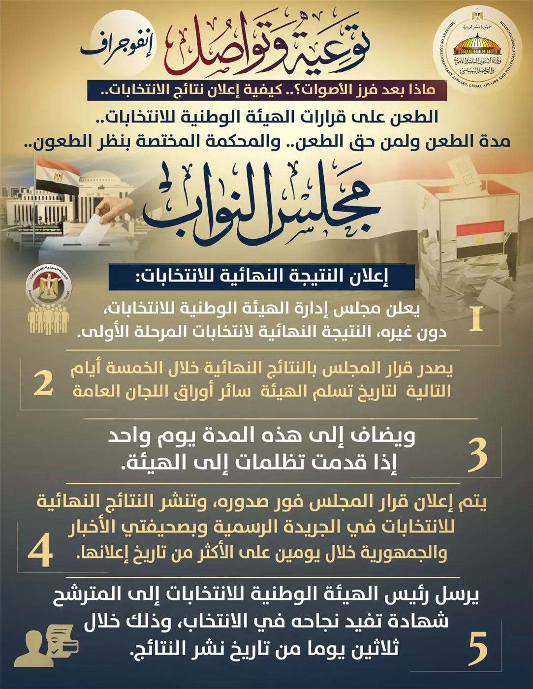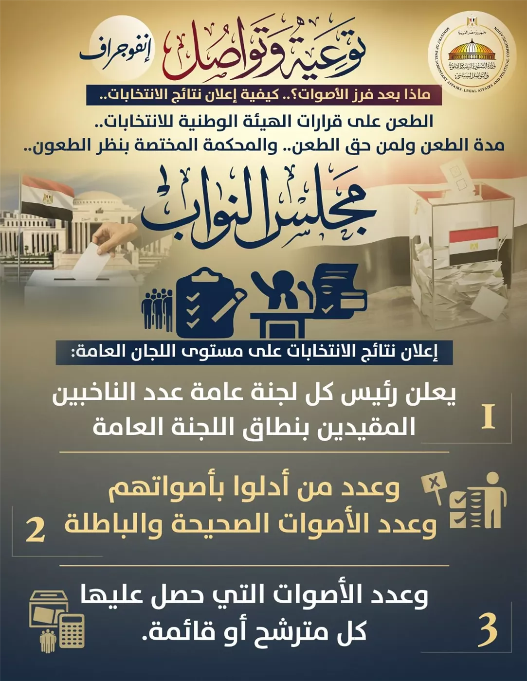 في إطار استمرار الحملة التوعوية التي أطلقتها وزارة الشؤون النيابية والقانونية والتواصل السياسي تحت شعار توعية وتواصل، نشرت الوزارة، اليوم الأربعاء، مجموعة من الإنفوجرافات السياسية التوعوية التي تضمنت معلومات شاملة حول المراحل التالية لعملية فرز الأصوات في انتخابات مجلس النواب وكيفية إعلان النتائج وآليات الطعن على قرارات الهيئة الوطنية للانتخابات والمدة القانونية المقررة لذلك والجهات التي يحق لها تقديم الطعون والمحكمة المختصة بالنظر فيها.