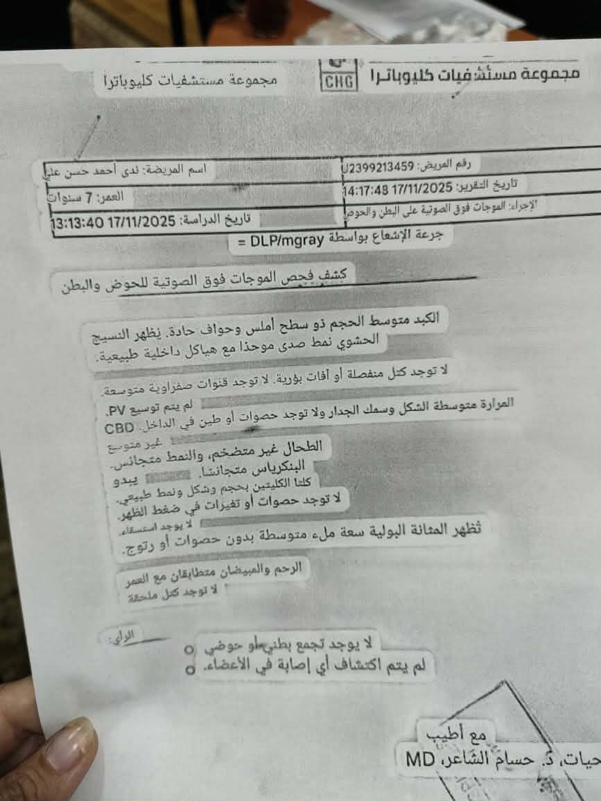 وتتطابق رواية المدرسة مع التقرير الطبي الصادر عن مستشفى كليوباترا، والذي خضعت الطفلة فيه لفحص شامل بالموجات فوق الصوتية على البطن والحوض. وأظهر التقرير – بعد طمس بيانات الطفلة حفاظًا على خصوصيتها – أن كل الأعضاء الحيوية في حالتها الطبيعية تمامًا؛ إذ أكد الفحص سلامة الكبد والطحال والمرارة والكليتين، وعدم وجود نزيف أو تجمعات دموية أو أي مؤشرات لإصابة داخلية.