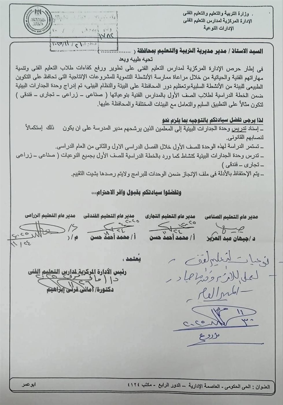 وجهت وزارة التربية والتعليم والتعليم، خطابا، للمديريات التعليمية، بشأن حرص الادارة المركزية لمدارس التعليم الفني، على تطوير ورفع كفاءات طلاب التعليم الفني، وتنمية مهاراتهم الفنية والحياتية من خلال مراعاة ممارسة الأنشطة التنموية للمشروعات الأنتاجية التي تحافظ على التكوين الطبيعي للبيئة من الأنشطة السلبية، وتعظيم دور المحافظة على البيئة والنظام البيئي.