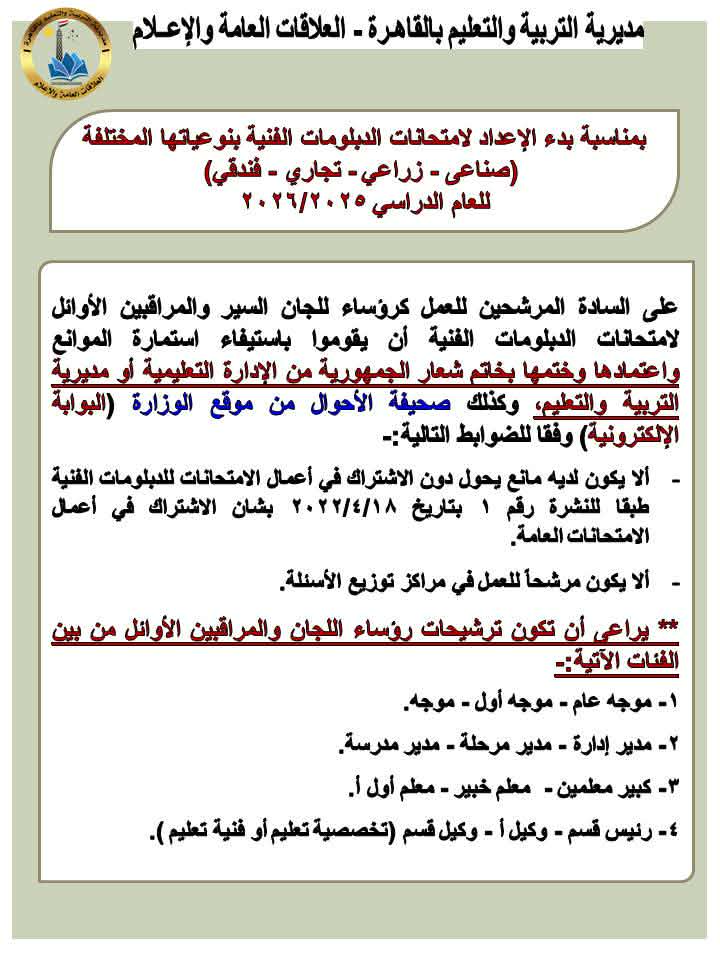 تعليم القاهرة تعلن شروط ترشيح رؤساء ووكلاء لجان امتحانات الدبلومات الفنية للعام الدراسي 2026/2025