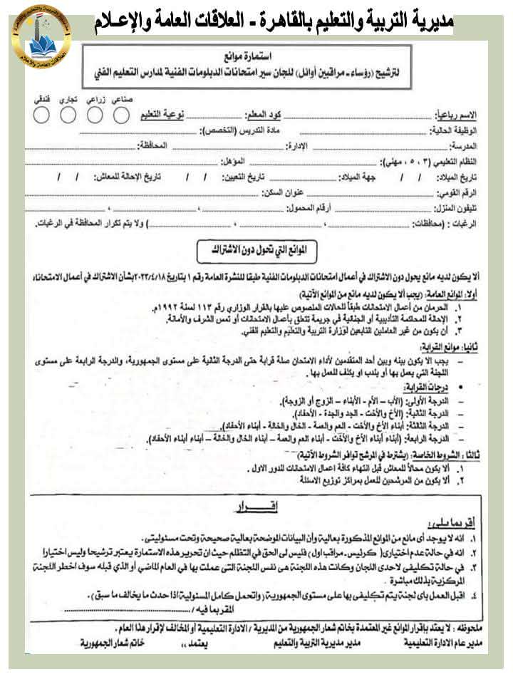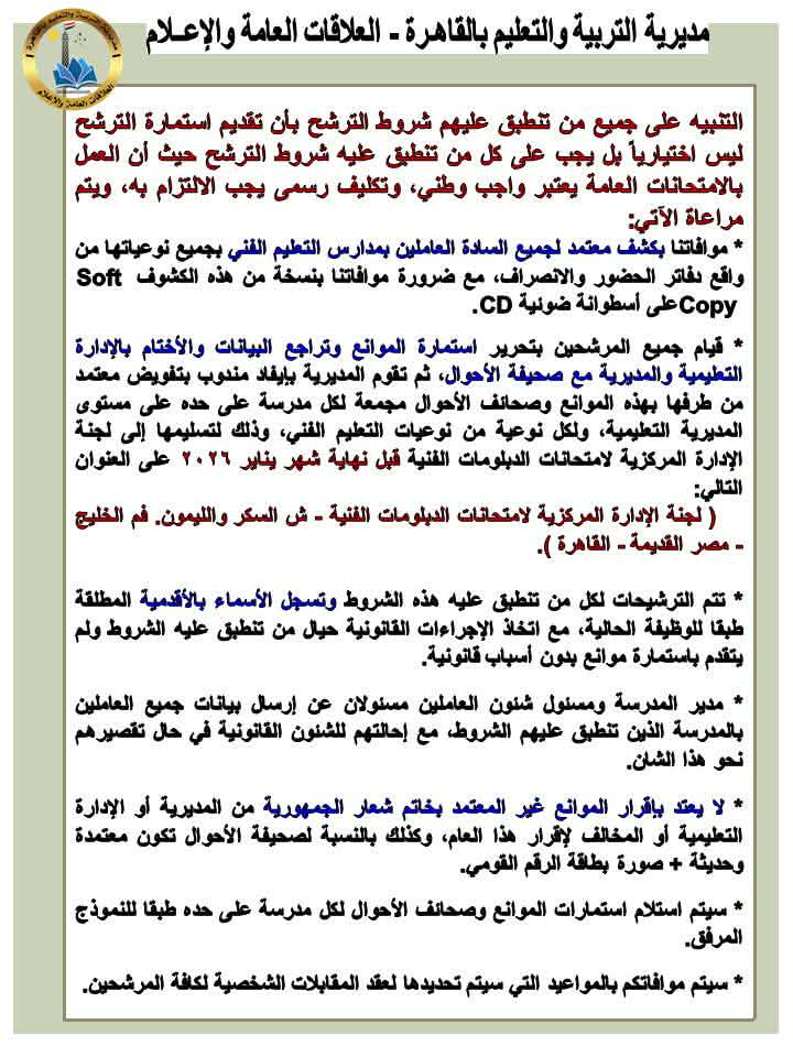 كما شددت المديرية على ضرورة الالتزام بالكشوف المعتمدة لجميع العاملين بمدارس التعليم الفني وفق دفاتر الحضور والانصراف، مع تقديم نسخة إلكترونية على أسطوانة CD، مؤكدة أن أي استمارة أو صحيفة أحوال غير معتمدة أو غير حديثة لن يتم قبولها، وسيتم استبعاد المرشح من المشاركة في أعمال الامتحانات.