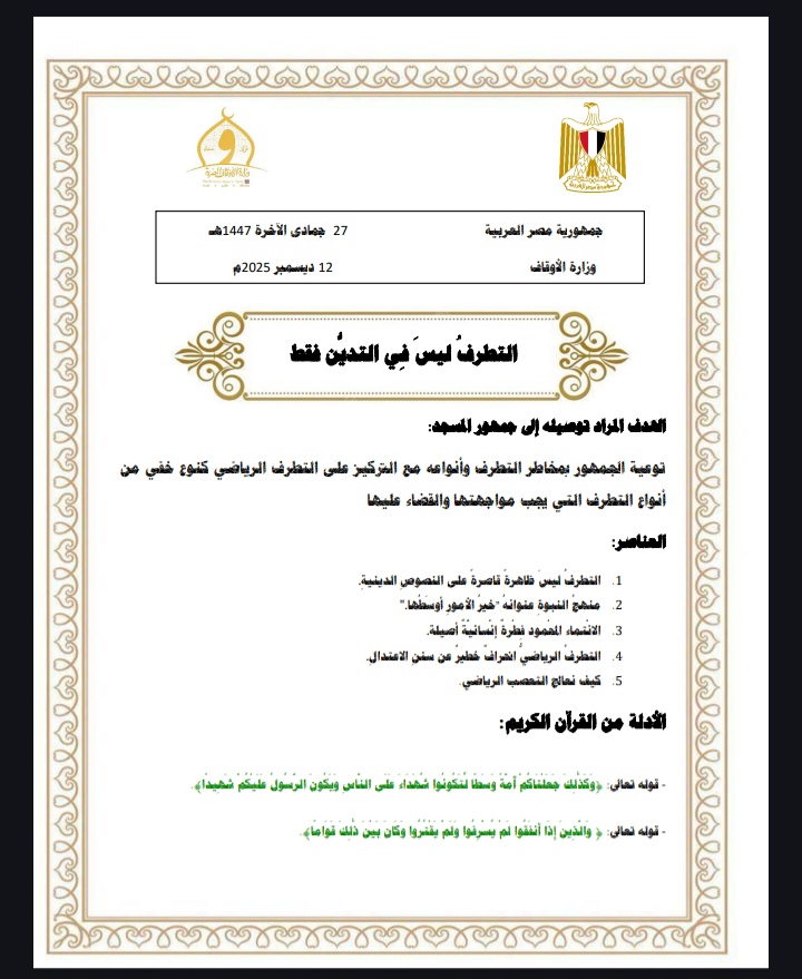 أعلنت وزارة الأوقاف المصرية عن موضوع خطبة الجمعة غدًا الموافق 12 ديسمبر 2025.