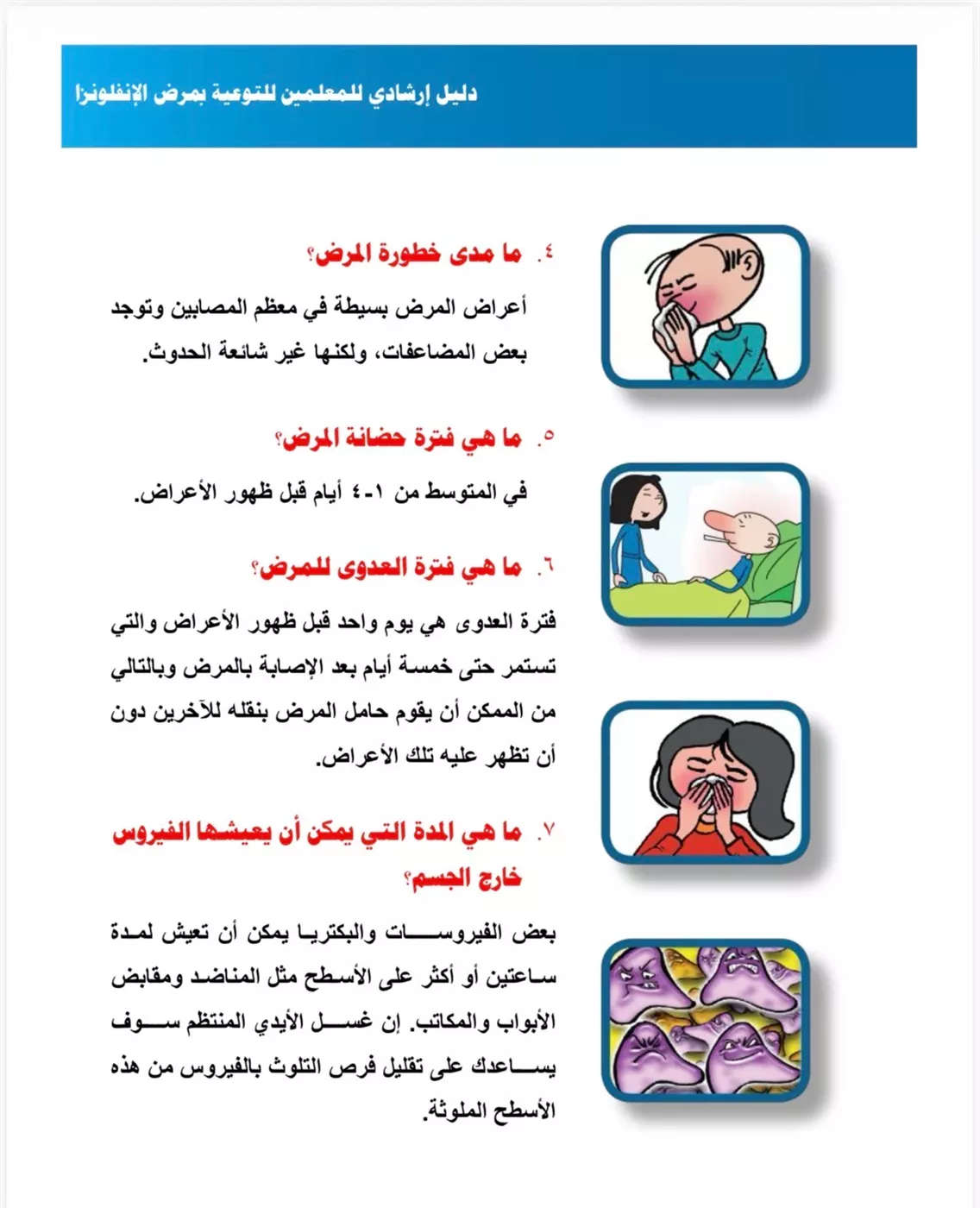 وأشار الدليل إلى أن التوعية الصحية داخل المدارس تعد جزءًا أساسيًا من مكافحة انتشار الإنفلونزا، حيث يجب على المعلمين وفرق الصحة المدرسية متابعة الطلاب، والتأكد من اتباعهم لإجراءات النظافة الشخصية والوقاية من العدوى.