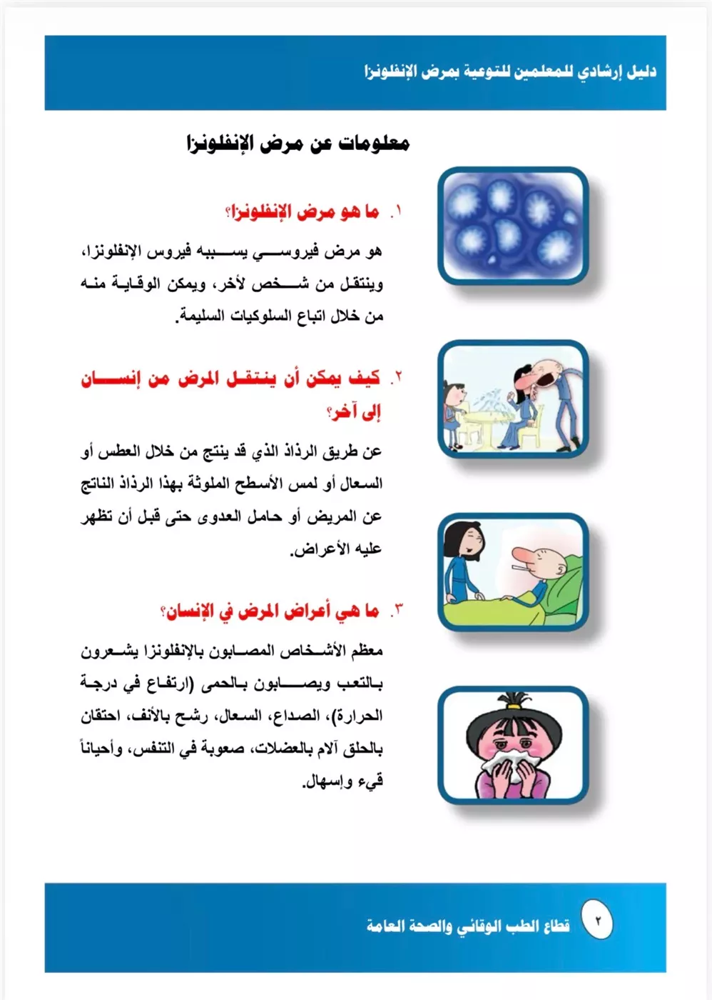 ويعرف الدليل مرض الإنفلونزا بأنه مرض فيروسي معدٍ ينتقل من شخص لآخر بسهولة عن طريق الرذاذ الناتج عن السعال أو العطس، أو من خلال لمس الأسطح الملوثة بالفيروس، مثل المقابض والطاولات والمكاتب.