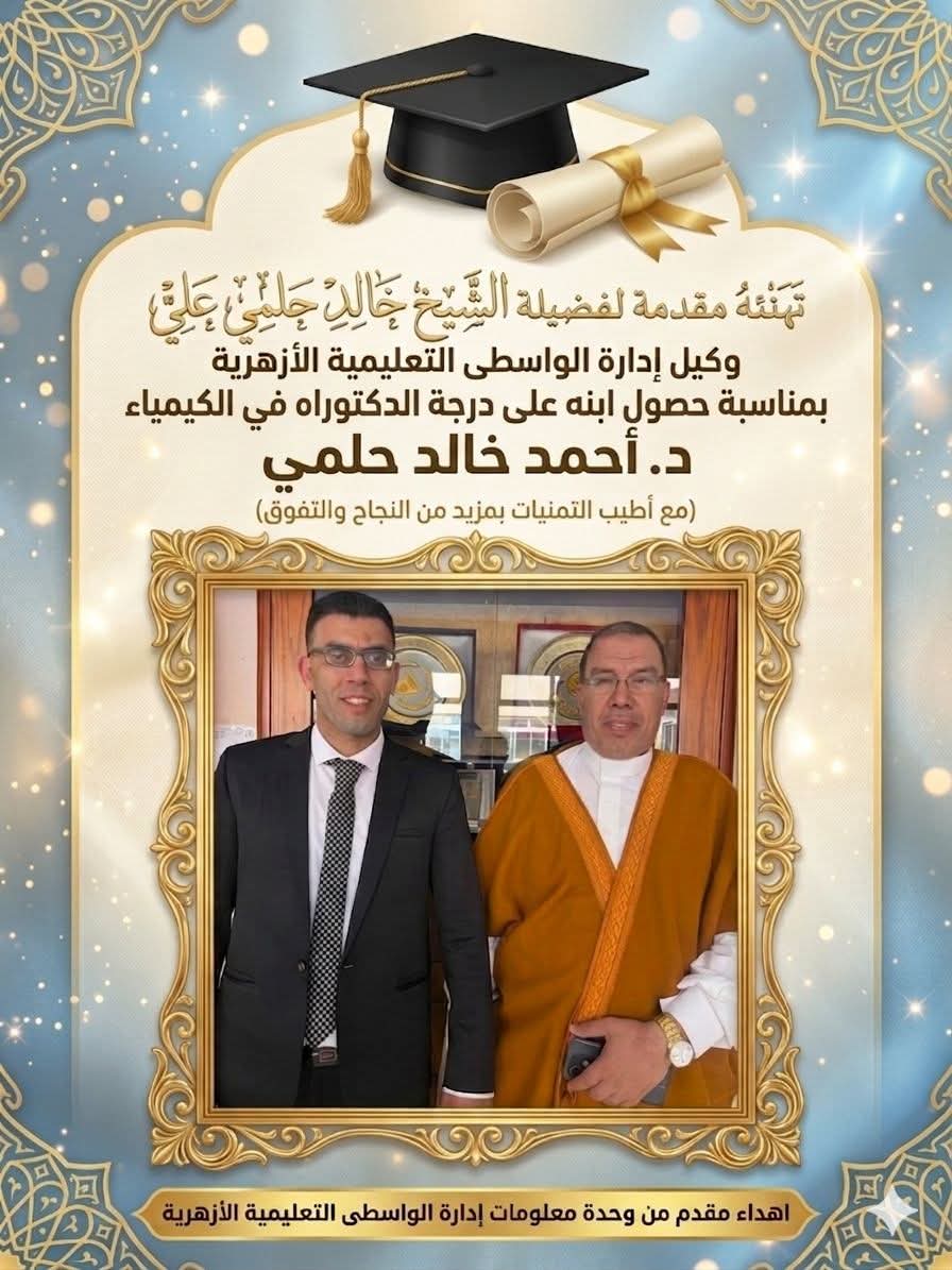 وفي السياق ذاته، تقدمت إدارة الواسطى التعليمية الأزهرية بخالص التهاني القلبية إلى فضيلة الشيخ خالد حلمي بمناسبة هذا الإنجاز المشرف لنجله، مؤكدة أن ما تحقق يُعد نموذجًا مُلهمًا لأبناء الأزهر الشريف، ويعكس قيمة العلم والاجتهاد، ومتمنية للدكتور أحمد خالد حلمي دوام التوفيق ومزيدًا من التقدم والنجاح في مسيرته العلمية.