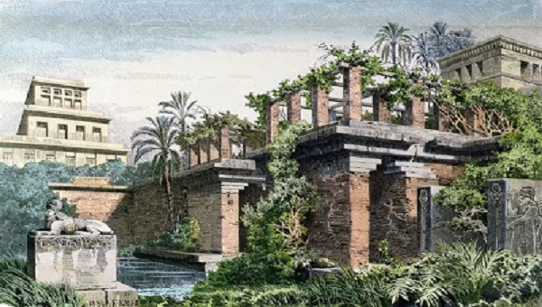 بنى الملك البابلى نبوخذنصر تلك الحدائق عام 600 قبل الميلاد لزوجته الملكة أمييهيا التى افتقدت الخضرة والحدائق فى وطنها ميديا .بنيت الحدائق فى بابل بالعراق وتعرف أيضا باسم سميرأميس بواسطة الأسرى الذين جلبهم الملك من بلاد الشام في ذلك الوقت وجعلهم يعملون ليل نهار وكانت محاطة بخندق مائى على ضفاف نهر الفرات. كان للحدائق المعلقة 8 بوابات كان أفخمها بوابة عشتار وزرعت فى الحدائق جميع أنواع الأشجار، الخضروات والفواكه والزهور و كانت تظل مثمرة طول العام وذلك بسبب تواجد الأشجار الصيفية والشتوية لذا فقد كانت غاية فى الروعة والجمال مما جعلها تدخل المرح والسرور إلى قلب الإنسان عند النظر إليها.
