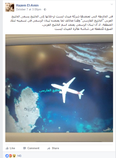 وعلق "حازم الأمين" على الصورة التي نشرها عبر صفحته الشخصية في موقع التواصل الاجتماعي "فيسبوك"، قائلا: "في الخارطة التي تعتمدها شركة ميدل ايست لرحلاتها إلى الخليج، يسمى الخليج العربي "الخليج الفارسي" وهذا مخالف لما يعتمده لبنان الرسمي في تسميته لتلك المنطقة، إذ أن لبنان الرسمي يعتمد اسم الخليج العربي"، مشيرا إلى أنه قام بالتقاط الصورة من شاشة طائرة الميدل إيست".