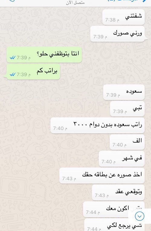 ونشر أحد المغردين صور المحادثة بين الفتاة السعودية والمقيم السوري، التي حاول فيها أن يساومها، ولكن رفضت الفتاة كل محاولاته مشددة على أنها بحاجة للعمل لإعالة عائلتها.