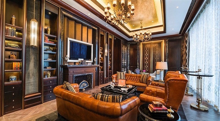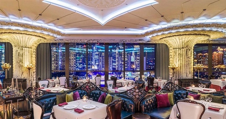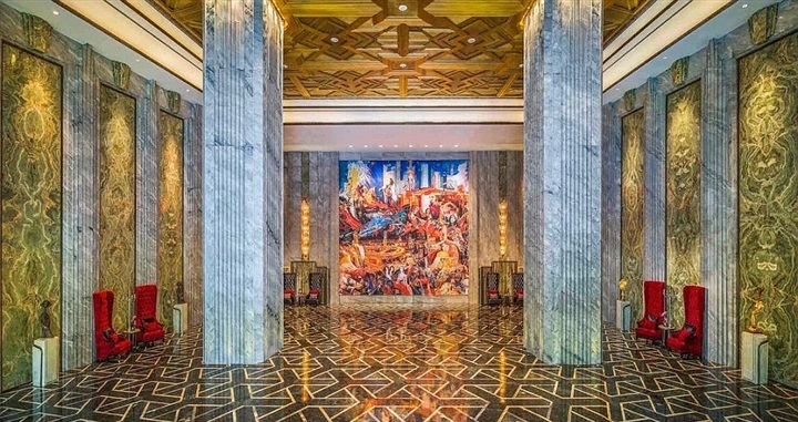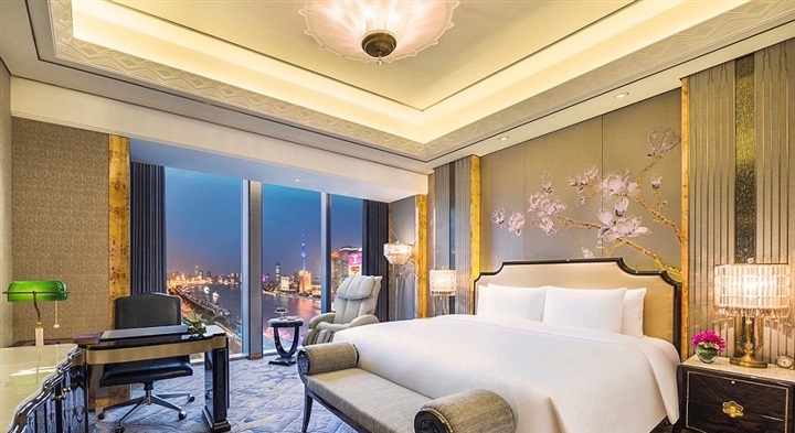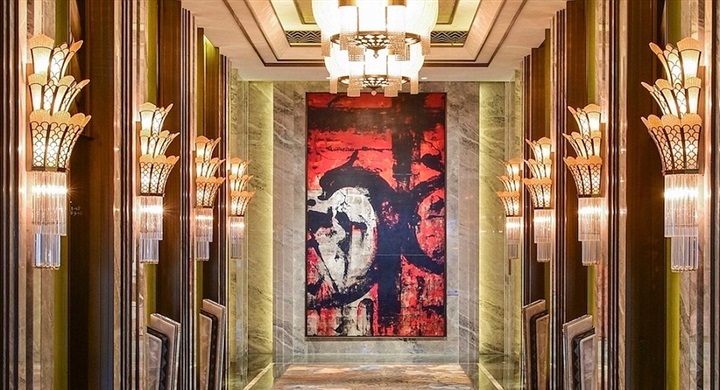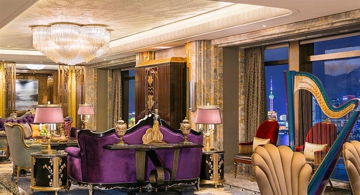 تألقت الثرايا بسقف الفندق وكذلك الأعمدة الرخامية، والتحف غالية الثمن، واستغرق بناء الفندق ثلاث سنوات بمدينة شنجهاى.