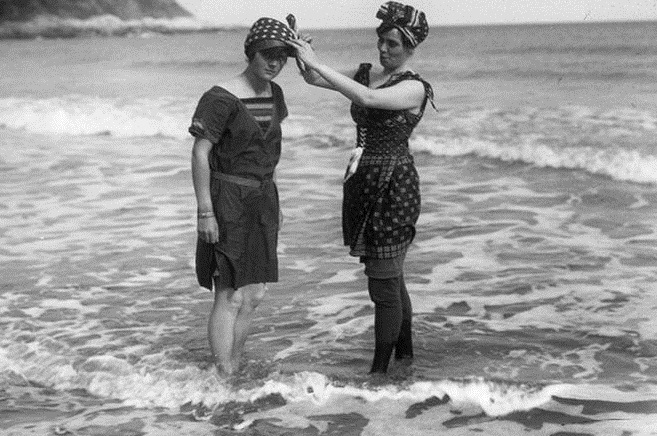 في فترة العشرينات من القرن الماضي، كانت السباحة على الشاطئ تتمثل بارتداء التنانير الطويلة والجوارب، عندما نصحت مصممة الأزياء العالمية كوكو شانيل النساء آنذاك، يالكف عن تغطية أجسامهن من الشمس.