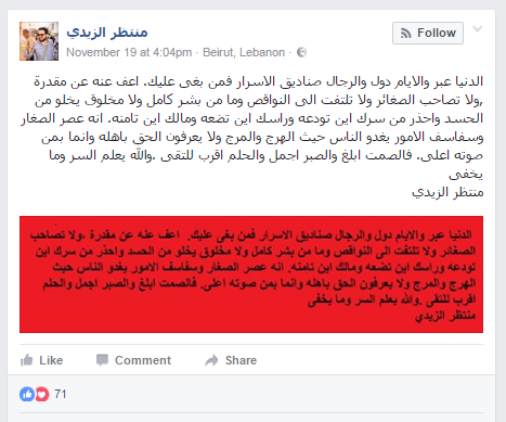 أمّا الزيدي، والذي قررت طليقته اللجوء للشبكات الاجتماعية بعدما قالت إنّه اتهمها بالخيانة "بناءً على حلم أنها على علاقة برجل آخر"، كما قالت، نشر على "فيسبوك" قائلاً: "الدنيا عبر والأيام دول والرجال صناديق الأسرار فمن بغى عليك".