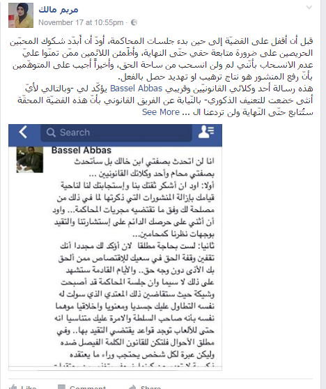من جهته كتب محاميها باسل عباس عبر فيسبوك إنّ موعد الجلسة بات قريباً وسوف يحاكم "ذلك الذي اعتدى عليك جسدياً وأخلاقيًا ومعنويصا.