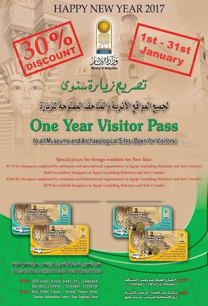 أعلن د. مصطفى أمين، الأمين العام للمجلس الأعلى للآثار مد فترة التخفيض على التصاريح السنوية الخاصة بالأجانب بنسبة 30% وكذلك تصريح Luxor Pass بنسبة 20%، والتي كانت قد أقرها مجلس إدارة المجلس الأعلى للآثار من قبل طوال شهر يناير 2017.