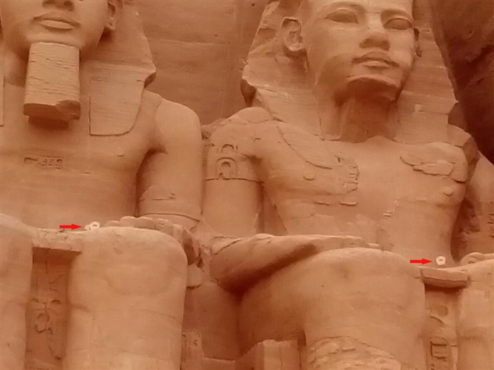 ولكن كل ما سبق يبدو أنه لم يكن يمثل أهمية كبري لمسئولينا عن الأثار المصرية القديمة، فهم وبكل أريحية قاموا بتثبيت كشافات إضاءة والكابلات الخاصة بها علي أجسام التماثيل الموجودة علي واجهة معبد أبو سمبل.