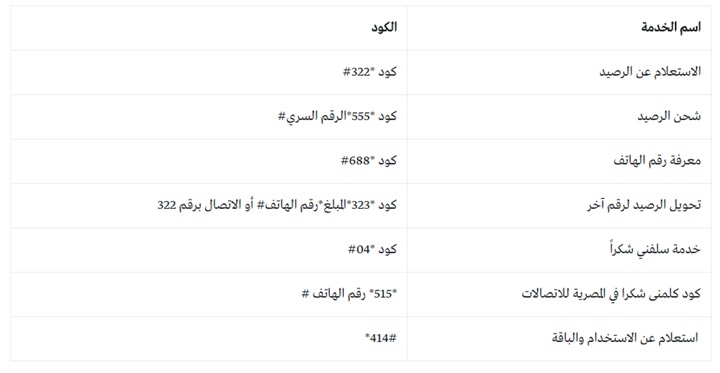 جدول أكواد خدمات خط وي: