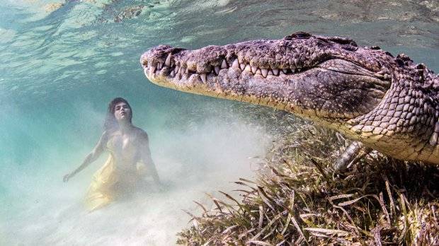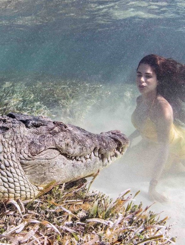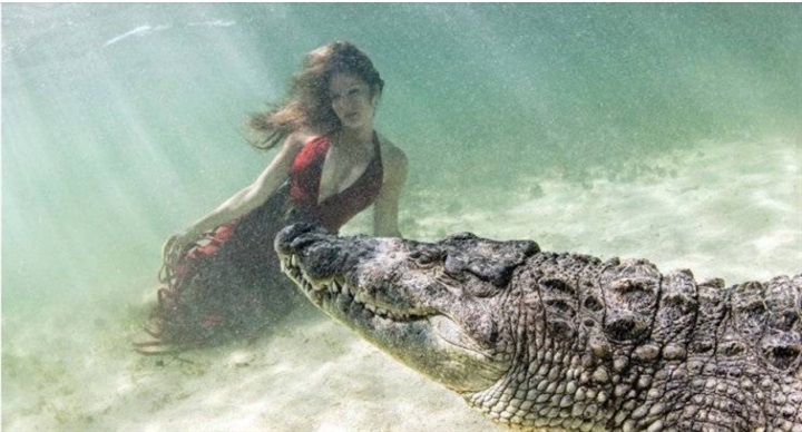عارضة أزياء تغامر بحياتها مع تمساح في جلسة تصويرية جريئة!