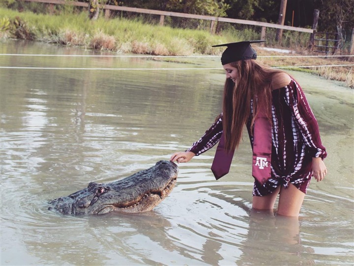احتفلت طالبة أميركية بطريقة مثيرة حين تخرجت من الجامعة إذ حرصت على أن تلتقط صورة بجانب تمساح استوائي وسط الماء، دون أن تكترث بالمخاطر التي قد تنجم عن الاقتراب من الحيوان المفترس.