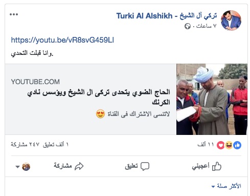 ومن جانبه أكد المستشار تركي آل الشيخ رئيس هيئة الرياضة السعودية السابق ورئيس الهيئة العامة للترفيه الحالي، عبر صفحته الرسمية على موقع التواصل الاجتماعي "فيسبوك"، قائلًا: "وأنا قبلت تحدي فريق الكرنك".
