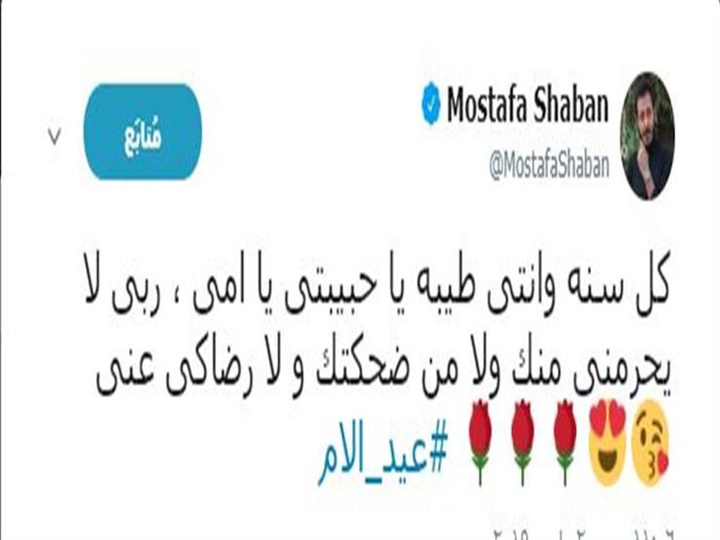 هنأ الفنان مصطفى شعبان والدته بعيد الأم، عبر حسابه الرسمي على "تويتر"، قائلاً: "كل سنة وأنتي طيبة يا حبيبتي يا أمي، ربي لا يحرمني منك ولا من ضحتك ولا رضاكي عني".