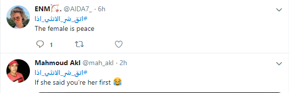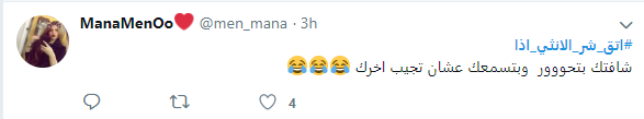 ومن جانبه قال "RJH_1000"، #اتق_شر_الانثي_اذا "جاتها الدورة"، ونهى كلماته بإيموشنات ضحك وسخرية على الفتاة عندما تأتيها الدورة الشهرية فتتحول من شخص عاقل لشخصية متهورة يتطلب اتقاء غضبها وشرها في هذه الحالة.
