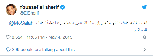 علق الفنان عبر حسابه الشخصي على تويتر، على إصابة اللاعب المصري المحترف محمد صلاح نجم ليفربول بعد تعرضة للإصابة بالامس خلال المباراة بين فريق ليفربول ونيوكاسل يونايتد، قائلا "الف سلامه عليك يا ابو مكه.. ان شاء الله تبقى بسيطه.. ربنا يطمنّا عليك".