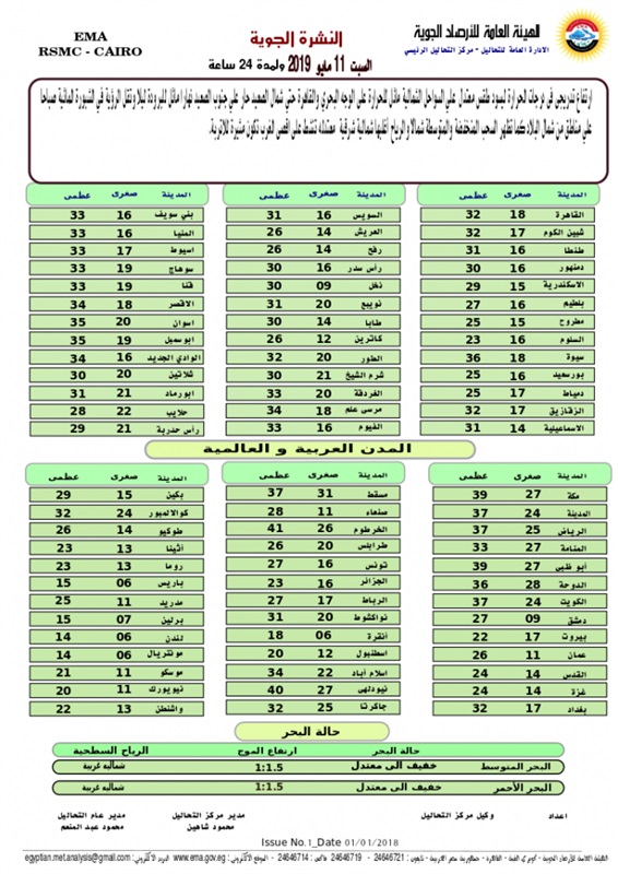 ليسود على البلاد طقس معتدل على السواحل الشمالية مائل للحرارة على الوجه البحري والقاهرة ويمتد حتى شمال الصعيد ويكون حارا على جنوب الصعيد نهارا مائل للبرودة ليلا، مع انخفاض فى الشبورة المائية صباحا على شمال البلاد كما تظهر السحب المنخفضة والمتوسطة على شرق البلاد، مع استمرار ارتفاع الموج على البحرين المتوسط والأحمر والذي يكون فيه الموج من متر الى متر ونصف وتكون الرياح السطحية شمالية غربية وفي نفس السياق حيث يشهد البحر الأحمر امواج معتدلة تقع ما بين المرت ومتر ونصف وتكون الرياح السطحية شمالية غربية.