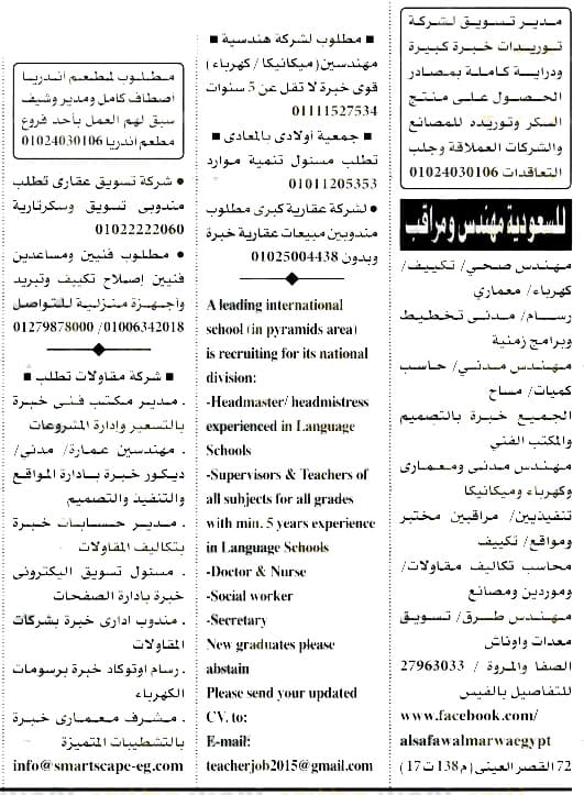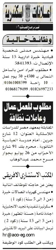ننشر الوظائف الخالية المنشورة اليوم ضمن العدد الأسبوعي لجريدة الأهرام ليوم الجمعة 17 مايو 2019، ومئات الوظائف في عدد كبير من التخصصات داخل مصر، وفرص عمل شاغرة للمصريين في دول الخليج (المملكة العربية السعودية ودولة الإمارات العربية المتحدة وسلطنة عمان والكويت ودولة قطر والبحرين).