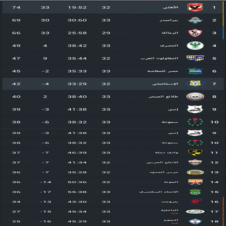 7- النادي الاسماعيلي في المركز السابع برصيد 42 نقطة حصيلة 32 مباراة.