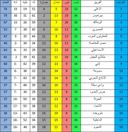 تعادل الزمالك مع الإنتاج الحربي أشعل القمة مع الأهلي حيث يتصدر الأهلي قمة الجدول برصيد 74 نقطة وله مباراتين مع المقاولون العرب والزمالك فى حالة الفوز على المقاولون العرب يصل للنقطة 77 يكفيه التعادل مع الزمالك للفوز بالدوري، أما الزمالك فرصيده حاليا 67 نقطة وله 4 مباريات مع حرس الحدود والجونة والإسماعيلي والهلي فى حالة الفوز على الجونة والحرس والإسماعيلي سيصل رصيده إلى 76 نقطة ويحتاج وقتها للفوز على الأهلي لتحقيق اللقب.