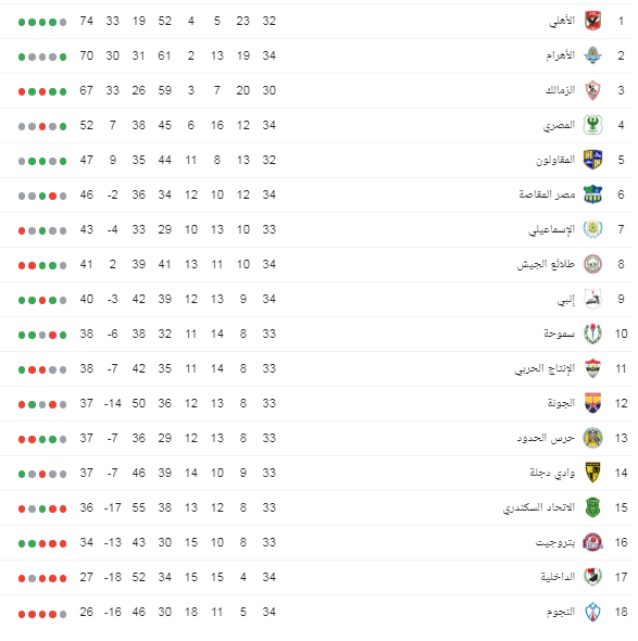 ويتصدر النادي الأهلي جدول ترتيب الدوري المصري برصيد 74 نقطة، بعد خوضه 32 مباراة، بينما يأتي فريق بيراميدز في المركز الثاني برصيد 70 نقطة من 34 مباراة، ثم فريق الزمالك في المركز الثالث برصيد 67 نقطة من 30 مباراة.