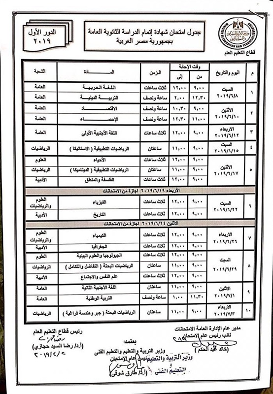 جدول امتحانات الثانوية العامة الدور الأول لعام 2019