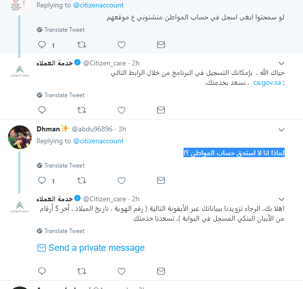 وقال المواطن السعودي دهمان عبر تغريدة نشرها حساب المواطن بالأمس "لماذا لا استحق حساب المواطن"، وجاء الرد على الفور من قبل خدمة العملاء مقاداه "اهلا بك، الرجاء تزويدنا ببياناتك عبر الأيقونة التالية ( رقم الهوية ، تاريخ الميلاد ، آخر 5 أرقام من الآيبان البنكي المسجل في البوابة )، تسعدنا خدمتك.