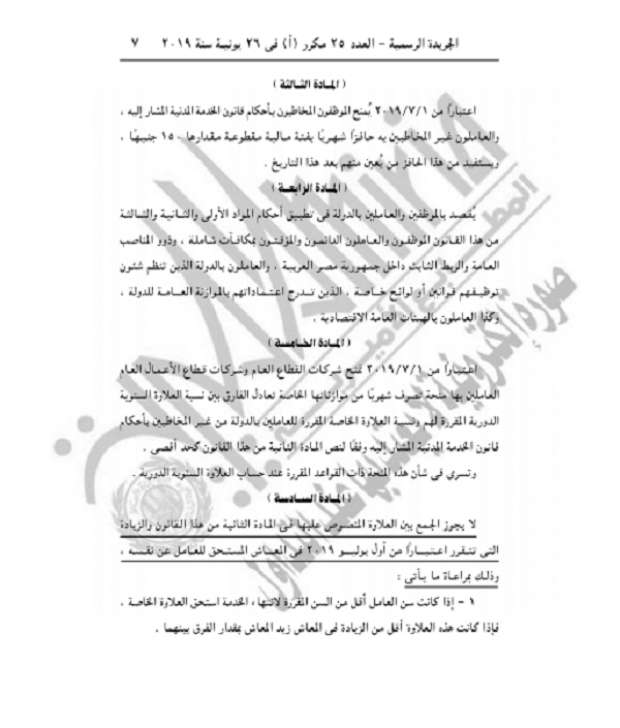 واعتبارًا من يوم 1 يوليو 2019 يمنح القانون العاملون بالدولة من غير المخاطبين بأحكام قانون الخدمة المدنية المشار إليه، علاوة خاصة بنسبة 10% من الأجر الأساسي لكل منهم في 30 يونيو 2019 أو في تاريخ التعيين بالنسبة لمن يعين بعد هذا التاريخ بحد أدنى 75 جنيهًا شهريًا، وتعتبر هذه العلاوة جزءًا من الأجر الأساسي للعامل، وتضم إليه اعتبارًا من 1 يوليو المقبل.