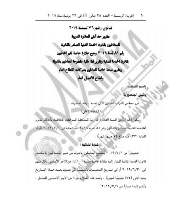 ونصت المادة الأولى من قانون الخدمة المدنية، على أن يكون الحد الأدنى لقيمة العلاوة الدورية المستحقة للموظفين المخاطبين بأحكام قانون الخدمة المدنية المستحقة في 1 يوليو 2019 طبقاً للمادة "37" منه مبلغ 75 جنيهًا شهريًا.
