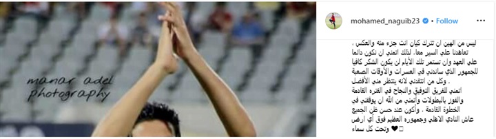 وكتب محمد نجيب عبر صفحته الشخصية على موقع الصور والفيديوهات "انستجرام" قائلاً: "بشكر النادي الأهلي وجمهوره العظيم ومجلس إدارة النادي واللاعبين علي الفترة التي قضيتها داخل جدران النادي".