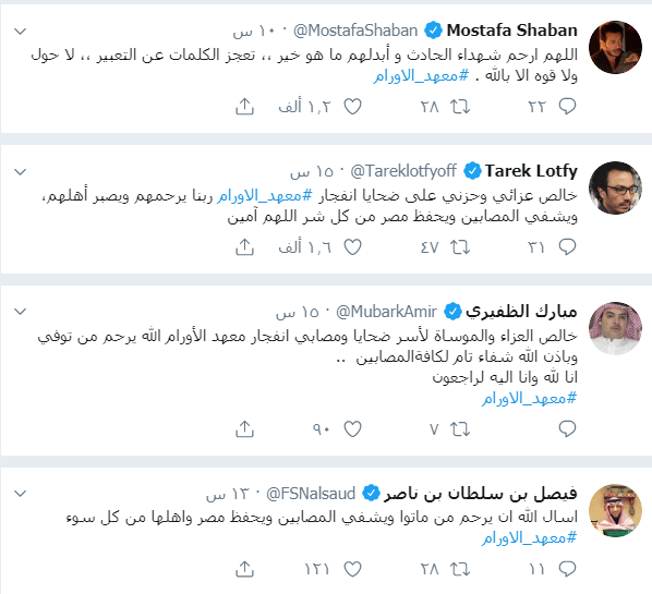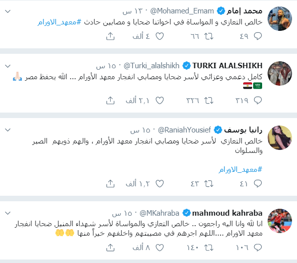 نعى كلا من نجوم الفن والرياضة والإعلام في مصر والعالم العربي، عبر تويتر ضحايا حادث انفجار معهد الأورام الذي وقع أمس الأحد ووصل عدد ضحاياه لـ20 قتيلا.