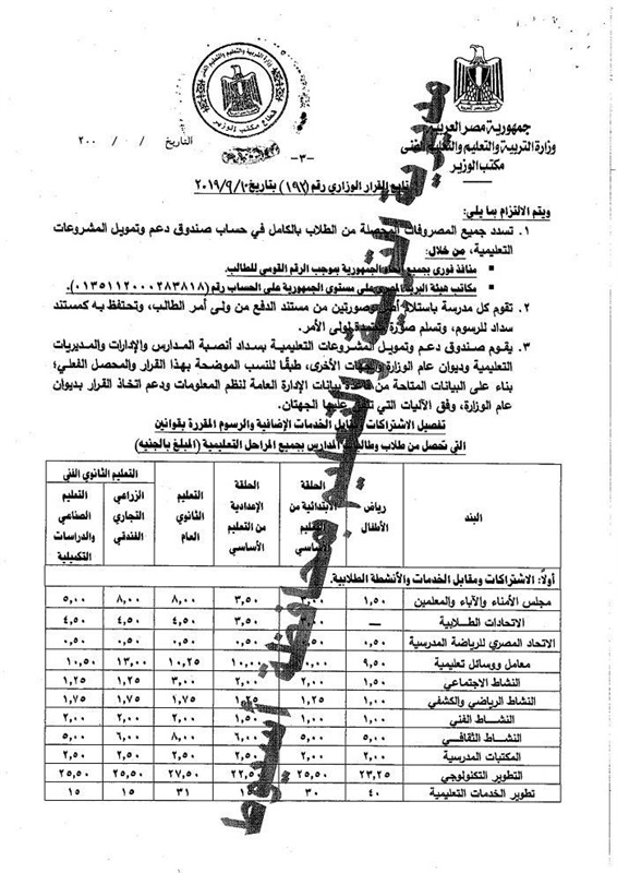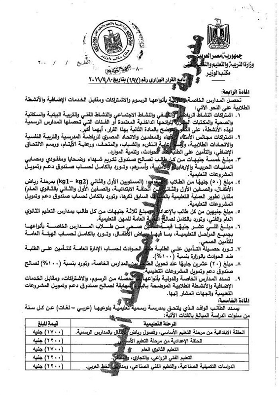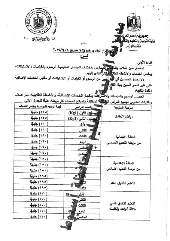 وجاء القرار رقم 193 لعام 2019 برسوم المراحل التعليمية كالآتي: