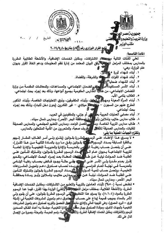 أعلنت وزارة التربية والتعليم والتعليم الفني، إعفاء 9 فئات من سداد الرسوم الدارسية والاشتراكات، وذلك بعد اعتماد الدكتور طارق شوقي، وزير التربية والتعليم القرار الوزاري رقم 193 لسنة 2019، الخاص بالرسوم والاشتراكات ومقابل الأنشطة والخدمات للمدارس الحكومية بمختلف المراحل التعليمية، وجاء نص القرارء بالفئات المعفاة كالآتي: