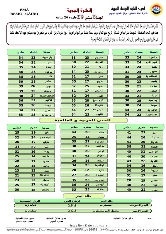بيان "الأرصاد" عن حالة الطقس في مصر ودرجات الحرارة في مدن ومحافظات الجمهورية وبعض المدن والعواصم العربية والأجنبية اليوم الجمعة 13/9/2019:
