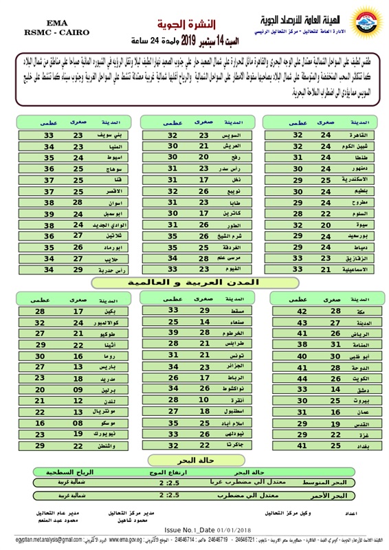 أصدرت الهيئة العامة للأرصاد الجوية بيانًا عن توقعات حالة الطقس اليوم الجمعة 13/9/2019 في جمهورية مصر العربية، وقالت "الأرصاد" إن حالة الطقس اليوم معتدلة على السواحل الشمالية مائل للحرارة رطب على الوجه البحري والقاهرة حتى شمال الصعيد، كما يسود طقس حار على جنوب الصعيد في النهار ولطيف في الليل، وتقل الرؤية في الشبورة المائية صباح الجمعة على شمال البلاد... لمعرفة المزيد اضغط هنا