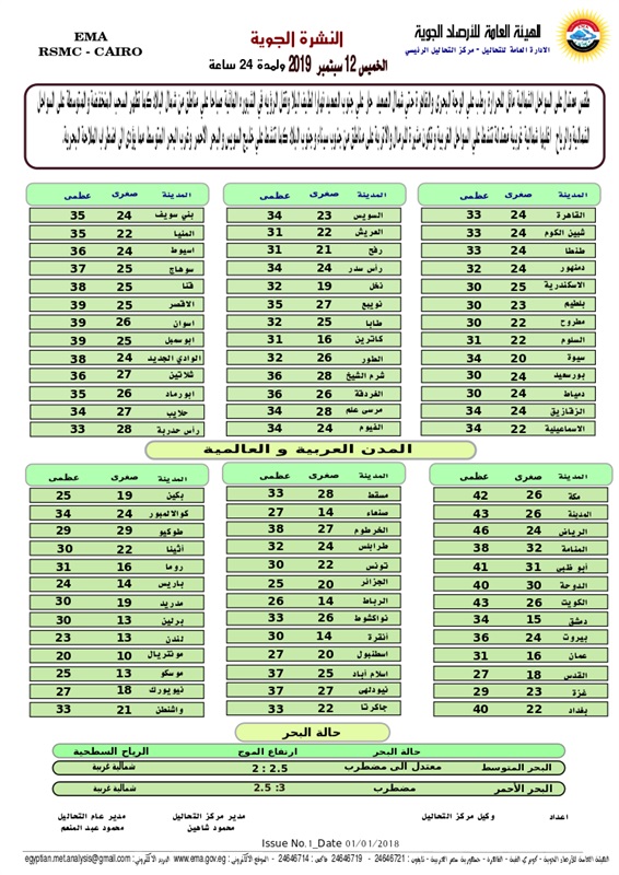 بيان الأرصاد بحالة الطقس اليوم الخميس 19 سبتمبر 2019 ودرجات الحرارة في مدن ومحافظات جمهورية مصر العربية وبعض المدن الأجنبية والعربية: